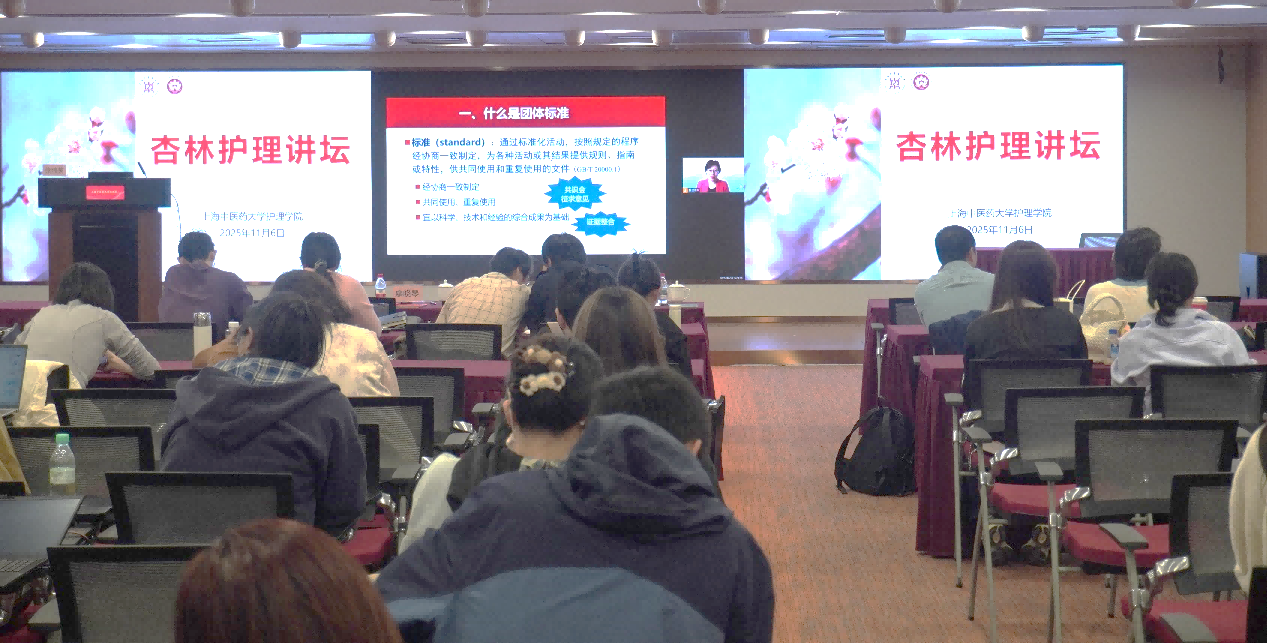2025年11月6日下午,第九期杏林护理讲坛在上海中医药大学标准化大楼辅楼201会议室成功举办。本次讲坛以“护理团体标准的申报、宣贯与撰写”为核心议题,由廖晓琴副院长主持,2024年度护理学科团体标准培育项目负责人、杏林攀峰科研计划培育项目负责人、研究生导师、杏林学者-护理青年人才、附属医院学术骨干、护理学院全体教职工及护理学科在读研究生等130余人参会。