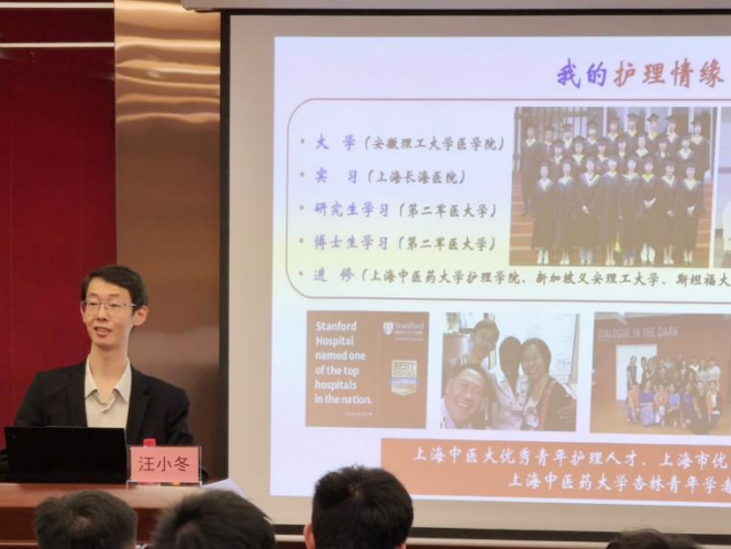 讲座伊始,汪小冬老师结合自身从护理学子到资深护士长的求学及工作经历分享了自己与护理事业的不解之缘。真挚的讲述既拉近了与同学们的距离,也让同学们对护理职业产生了更加立体鲜活的认知。