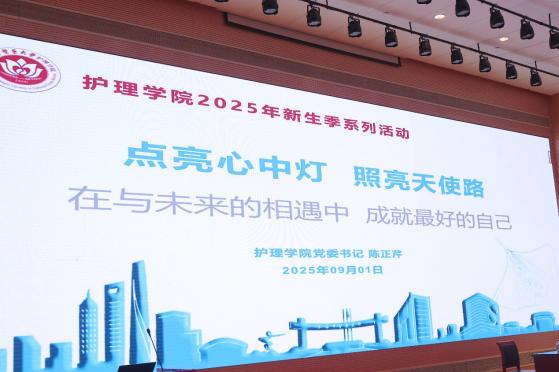 2025年9月1日,上海中医药大学护理学院党委书记陈正芹在图四报告厅以《点亮心中灯,照亮天使路——在与未来的相遇中,成就最好的自己》为题,为2025级本科及研究生新生带来了一场深刻而温暖的“书记第一课”,讲座由护理学院党委副书记李媛主持。