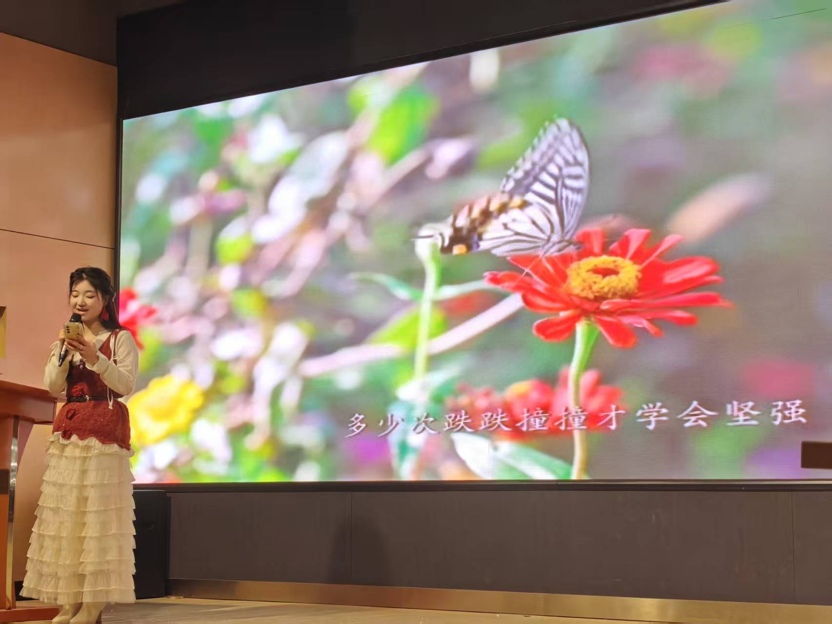 聚光灯下,韩恩琪同学轻启歌喉唱响《微微》,清甜的歌声裹着大屏里摇曳的花草、翩飞的蝴蝶,把“微微”的力量揉进旋律里缓缓诉说。当“多少次跌跌撞撞才学会坚强”的歌词响起,温柔的声线里藏着的坚定,让平凡的勇气在舞台上漾开层层暖意。