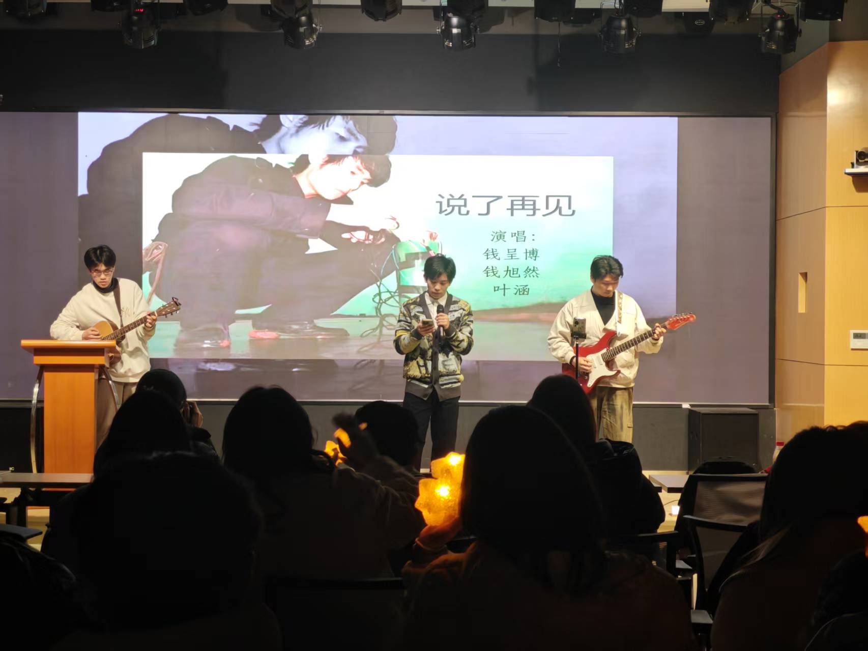 全场屏息的压轴时刻终于来临!钱呈博、钱旭然与叶涵三位同学并肩登场,一首《说了再见》瞬间引爆全场的焦点。清脆的吉他弦音率先响起,三人的歌声默契交织,把离别里的怅然与不舍唱得淋漓尽致,每一句歌词都戳中人心,让这场元旦晚会的收尾,惊艳又难忘!