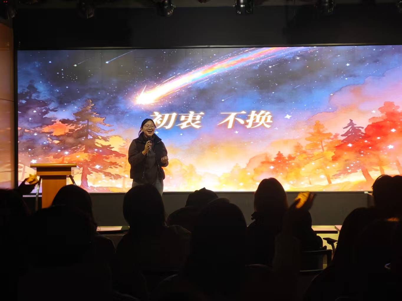 漫天星河揉着流星的碎光在大屏上流淌,陈乐祺同学站在这片梦幻的光影里,抬手执麦唱响《裹着心的光》。她的歌声似一缕暖光穿破夜色,裹着心底的热忱与坚守,从舞台中央轻轻漾开,让藏在旋律里的那份坚定,温柔地触碰到了每一位听众的心底。