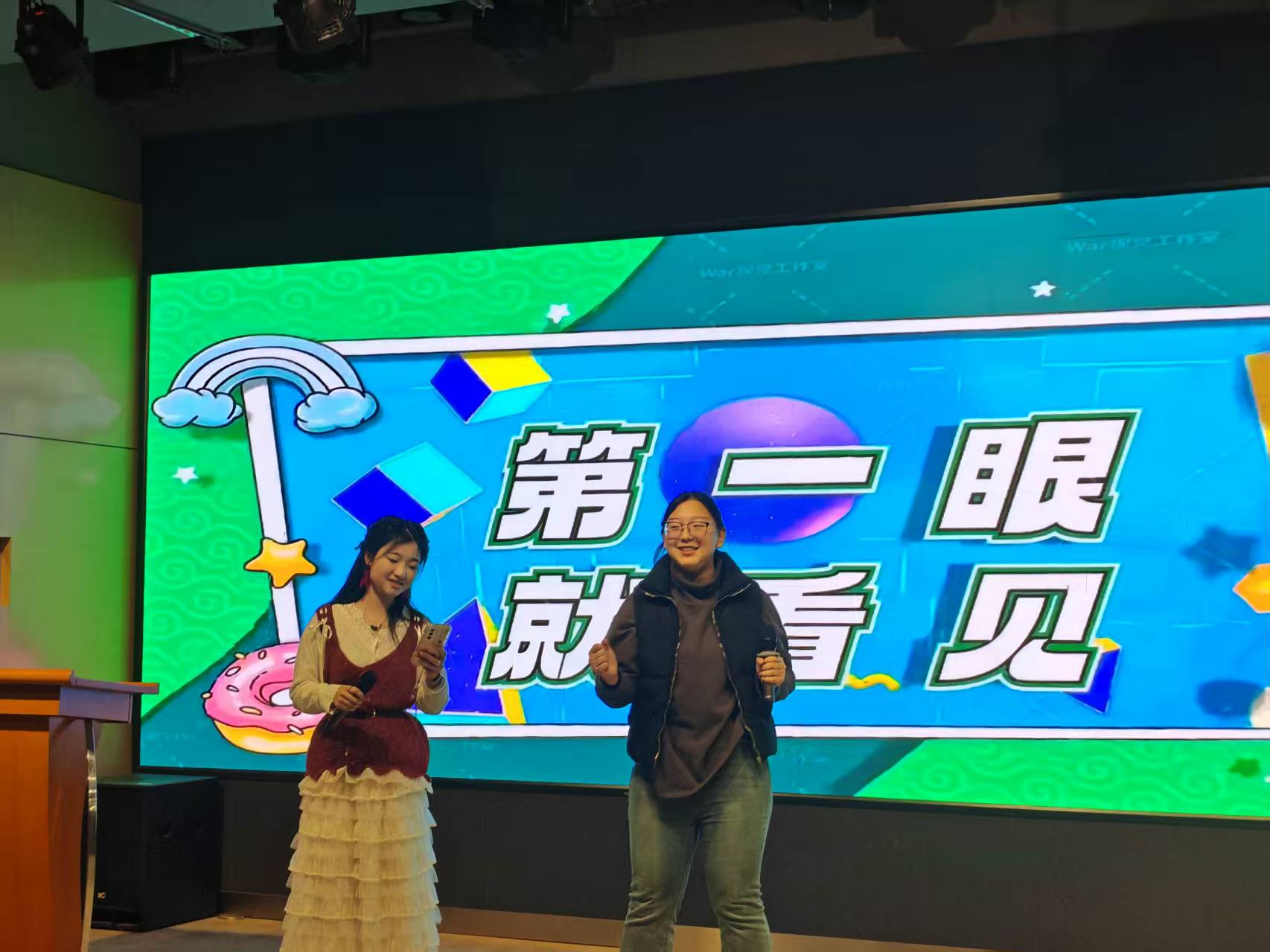 欢快的旋律刚一响起,韩恩琪与陈乐祺同学就笑着并肩站上舞台,合力唱响《凑热闹》。大屏上明晃晃的彩色字幕跟着鼓点蹦跳,两人的歌声像撒了把甜甜的糖果,把青春的鲜活与热闹揉进每一个音符里,瞬间点燃了全场的欢乐氛围,台下的笑意也跟着歌声一起漾开啦。